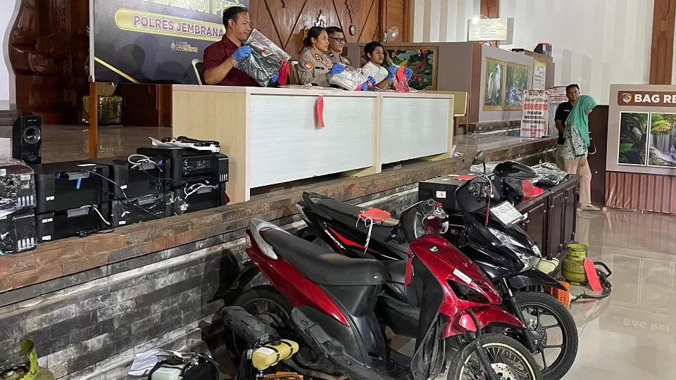 Kapolres Jembrana merilis kasus pencurian dengan pemberatan (curat) yang menyasar belasan sekolah dasar sekaligus memperlihatkan barang bukti hasil kejahatan di Gedung Auditorium Jembrana, Selasa (20/1/2026). (Foto: BaliExpress)