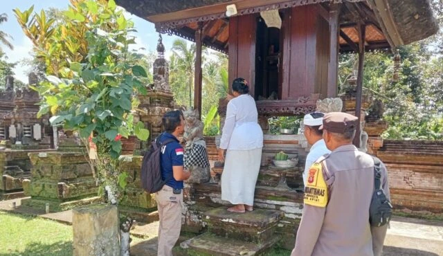 Petugas kepolisian bersama pengurus adat melakukan pengecekan di Pura Puseh Desa Adat Dadia, Babahan, Penebel, Tabanan, pasca terjadinya pencurian uang kepeng. (Foto: Istimewa)