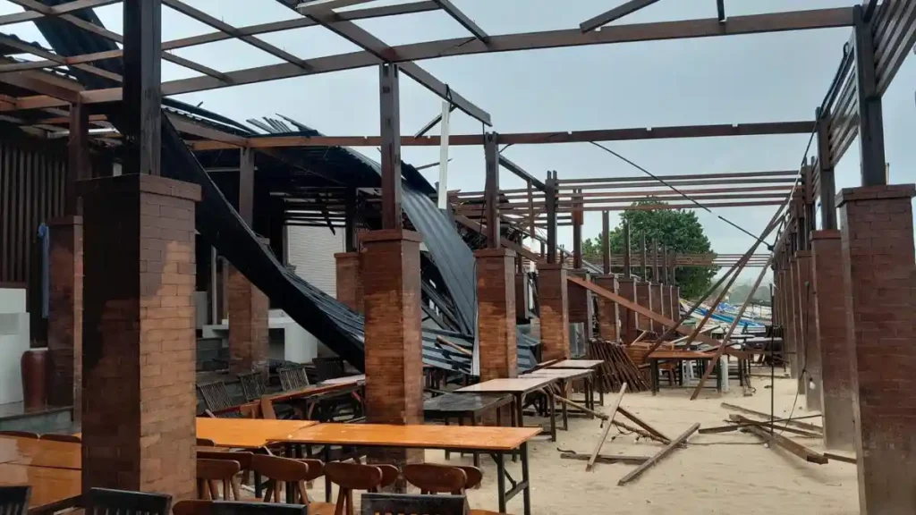 Berdasarkan pantauan di lokasi kejadian, kondisi sejumlah kafe tampak porak-poranda. Rangka atap berbahan kayu terlihat patah dan runtuh, sementara lembaran penutup atap berukuran besar menimpa area makan. Meja dan kursi kayu yang biasanya tertata rapi di atas pasir pantai terlihat berserakan, terbalik, dan sebagian tertimbun puing bangunan di atas pasir yang basah akibat cuaca buruk.