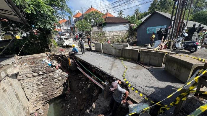 Petugas memasang garis pembatas di lokasi jalan ambles yang mengakibatkan akses kendaraan terganggu di kawasan Denpasar, Bali. (Foto: Istimewa)