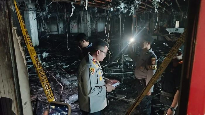 Petugas kepolisian melakukan olah TKP di dalam bangunan bekas Mall Matahari Kuta Square yang terbakar pada Selasa (16/9/2025) pagi. (Foto: Istimewa)