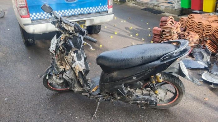 Dua sepeda motor matik, masing-masing berwarna putih dan hitam, terlibat tabrakan keras yang mengakibatkan satu orang tewas di lokasi kejadian dan satu lainnya mengalami luka berat.