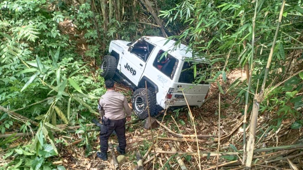 “Diduga pengemudi panik setelah ban depan kiri terangkat akibat melindas batu, sehingga kendaraan oleng dan jatuh ke jurang,” jelas AKP Berata.