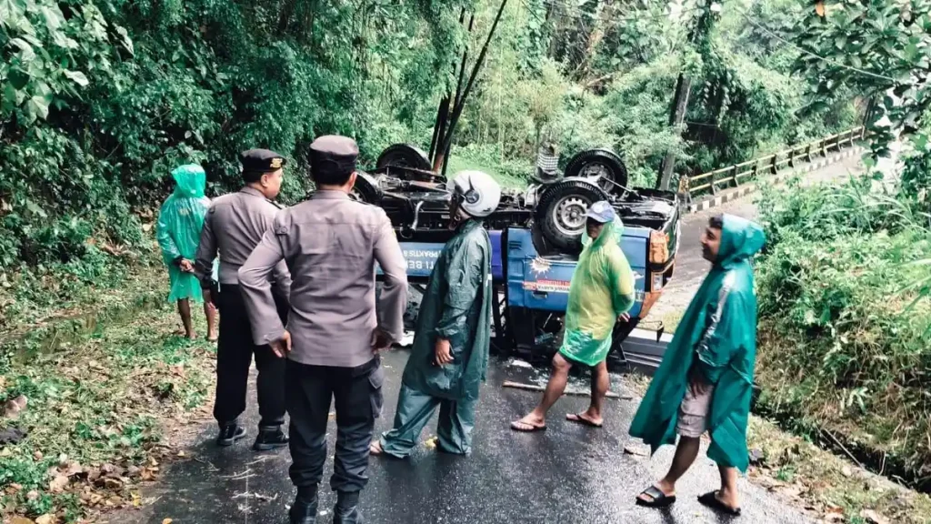 “Saat memasuki tanjakan, kendaraan diduga kehilangan kendali karena muatannya terlalu berat, sehingga mobil terguling di badan jalan,” ujar AKP Budiarsana saat dikonfirmasi.