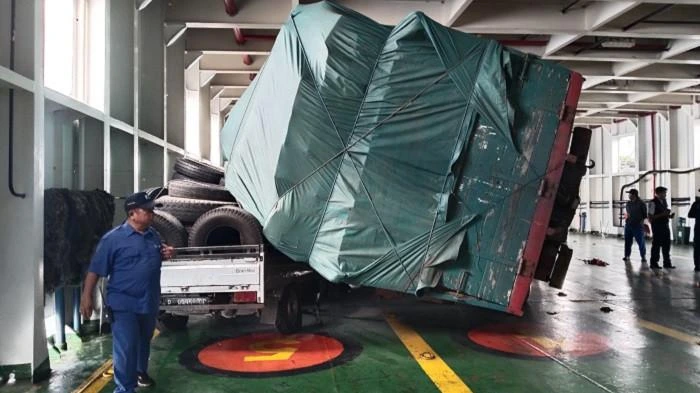 Tinggi gelombang mencapai 2 hingga 2,5 meter, sementara jarak pandang terbatas. Situasi tersebut membuat truk yang berada di dalam kapal terguling hingga menimpa dua mobil penumpang.
