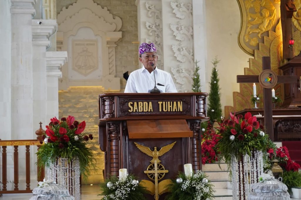 Gubernur Koster menegaskan bahwa peran gereja sebagai pilar moral sangat penting dalam merawat peradaban Bali yang inklusif dan berlandaskan nilai-nilai spiritual. Ia juga menyoroti relevansi tema Natal 2025, “Allah Hadir untuk Menyelamatkan Keluarga”, dengan arah pembangunan Bali ke depan.