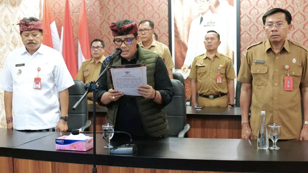 TABANAN, INFODEWATA.COM – Bupati Tabanan, Dr. I Komang Gede Sanjaya, S.E., M.M., resmi mengukuhkan dan melantik 56 pejabat di lingkungan Pemerintah Kabupaten (Pemkab) Tabanan. Prosesi pelantikan berlangsung secara hybrid di Tabanan Command Center (TCC), Senin (1/9/2025), disaksikan langsung maupun daring oleh jajaran pejabat daerah.